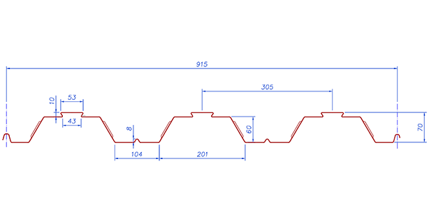 Aldeck 70/915, the original and still the most popular deck in the market is a 70 mm high, structurally efficient trapezoidal profile providing an excellent composite union between steel and concrete to maximize the carrying capacity and spanning up to 4.5 m (no props). The efficient shape of the deck and resulting composite slab make an excellent option for composite team design.